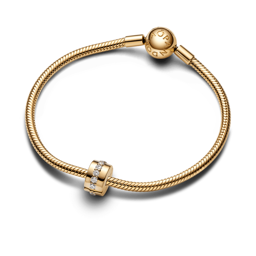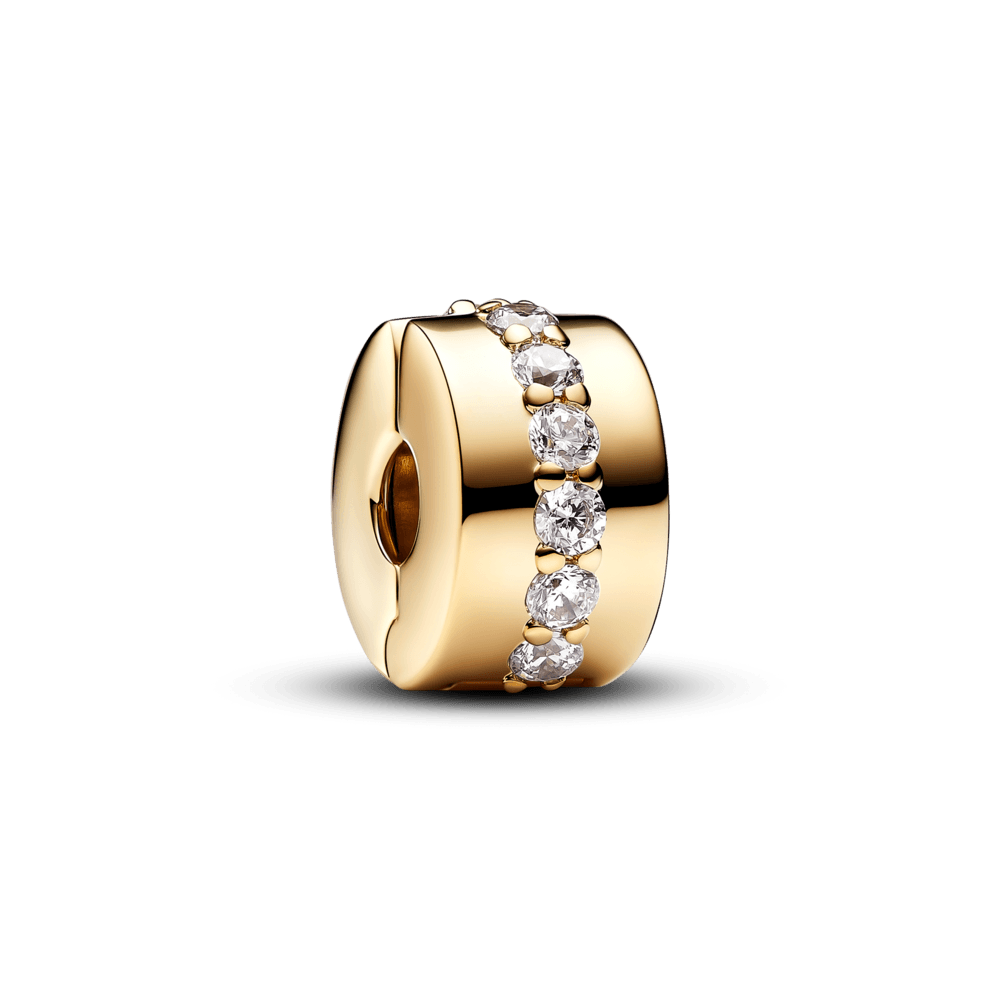 Equilibra tu Brazalete de charms de Pandora con este charm de clip. Esta elegante joya con un recubrimiento en oro de 14k acentúa su belleza con una fila de relucientes circonitas cúbicas transparentes. El clip no incluye agarre de silicona, por lo que se deslizará si no se coloca sobre las roscas (dos separadores de charms en relieve).