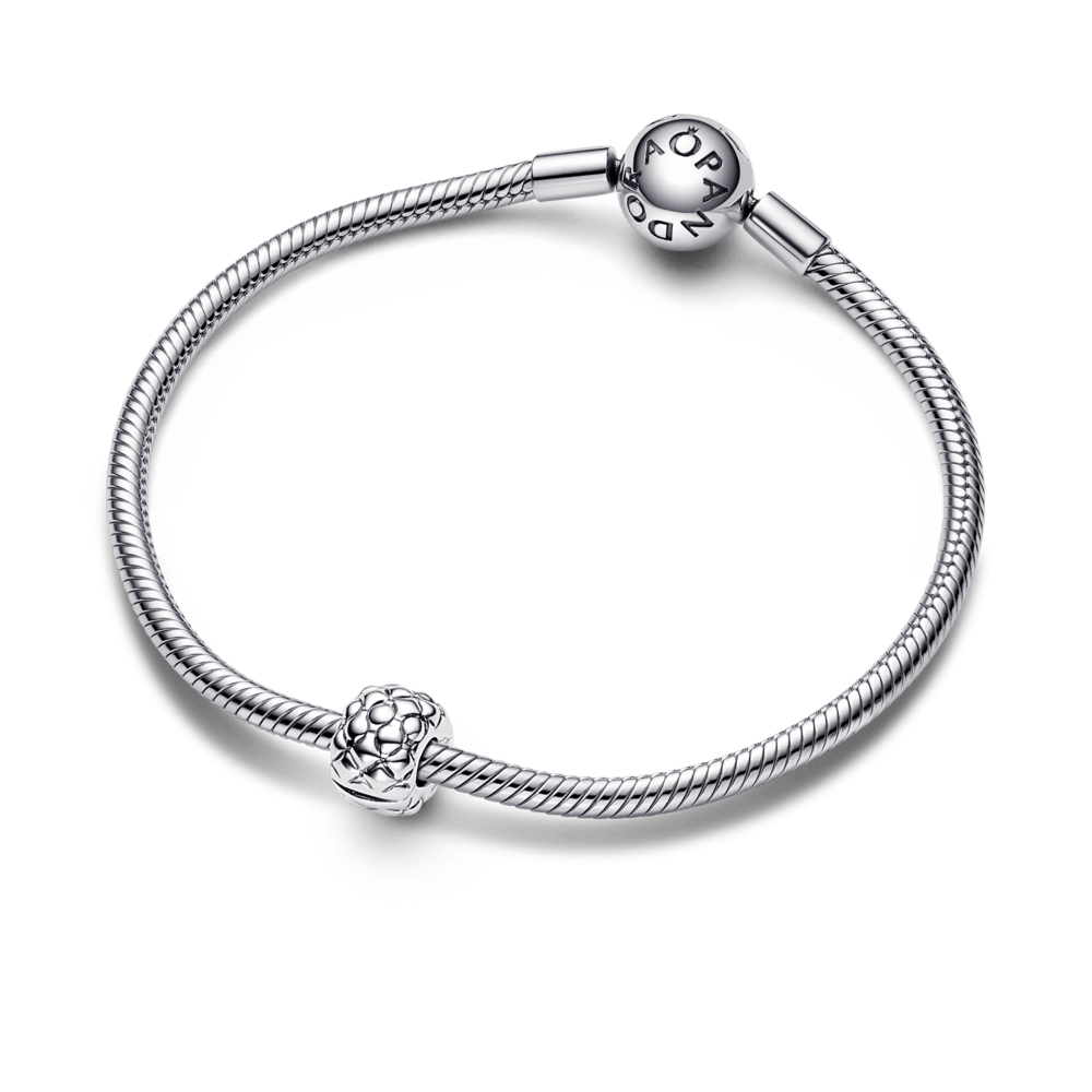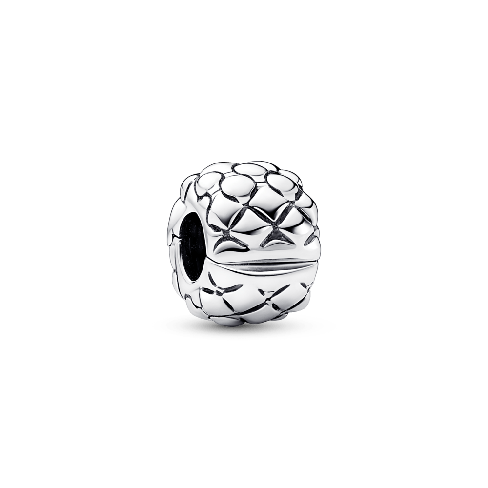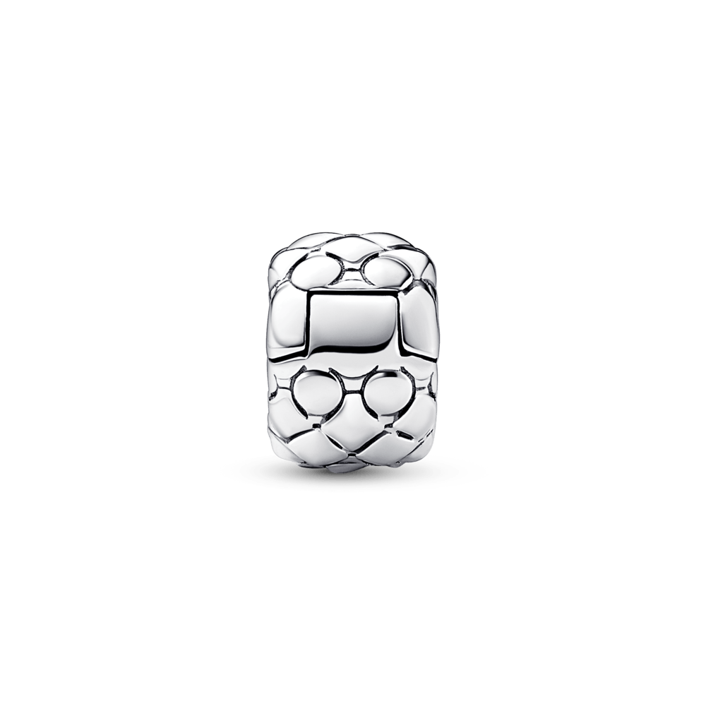 Potencia aún más tu estilo con la icónica textura con tachuelas del Clip con Tachuelas ancho en plata de primera ley. Con su textura de tachuelas esféricas y piramidales, este clip será perfecto para tu pulsera con tachuelas ya que su diseño refleja el nuevo icono de Pandora. Este clip no tiene de silicona en su interior, por lo que agregará movimiento a tu estilo, además de separar tus charms. Si lo pones en las roscas, no se moverá, y servirá para separar los charms. Crea un llamativo estilo camuflaje llevándolo en la cadena con tachuelas del mismo tono.