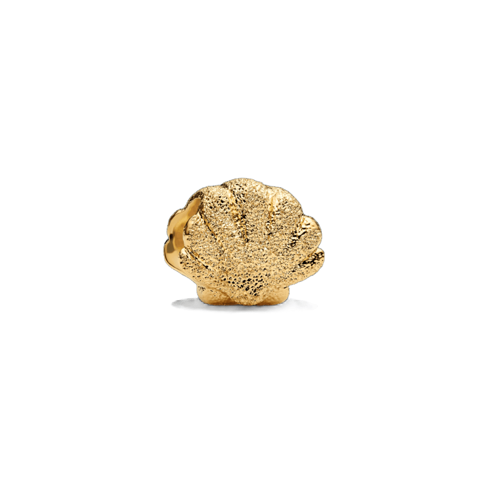 ¿Escuchas su sonido? El cambio viene en olas. Nuestro mini charm de concha bañado en oro de 14k tiene una textura de punta de diamante y es un pequeño símbolo de descubrimiento, fuerza y la belleza oculta justo debajo de la superficie.
