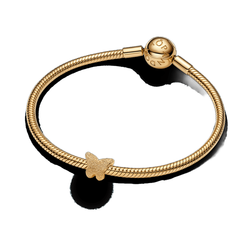 Haz una declaración sutil con las Miniaturas de Pandora. Nuestro charm de mariposa bañado en oro de 14k es pequeño en tamaño pero grande en significado. Con una textura de punta de diamante, está listo para volar en tu colección.